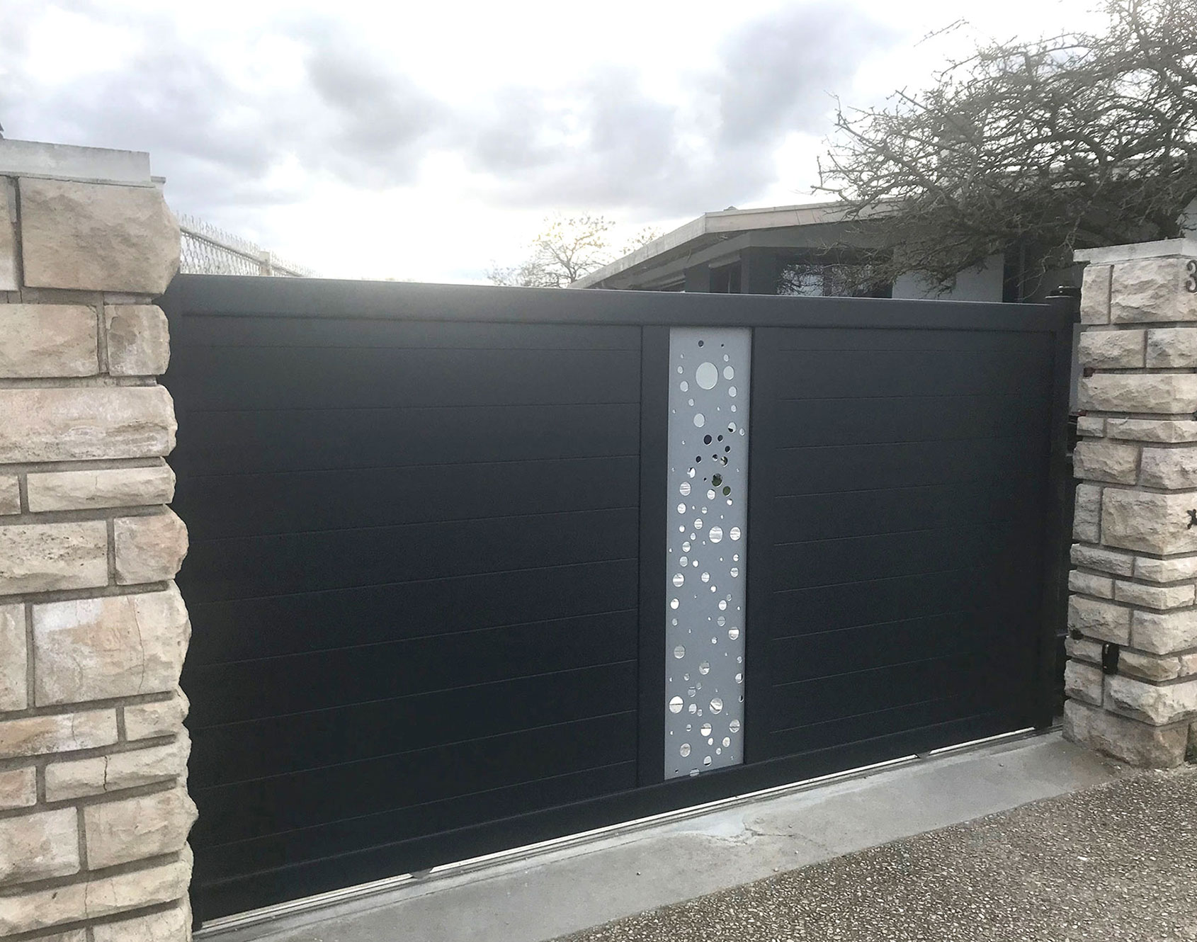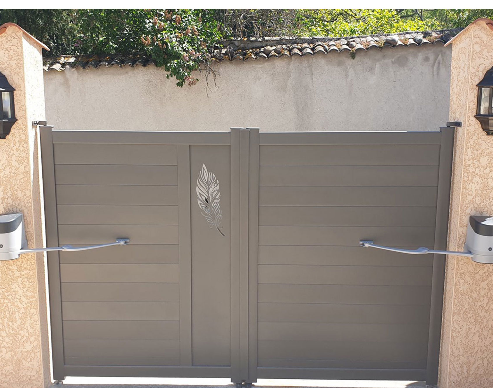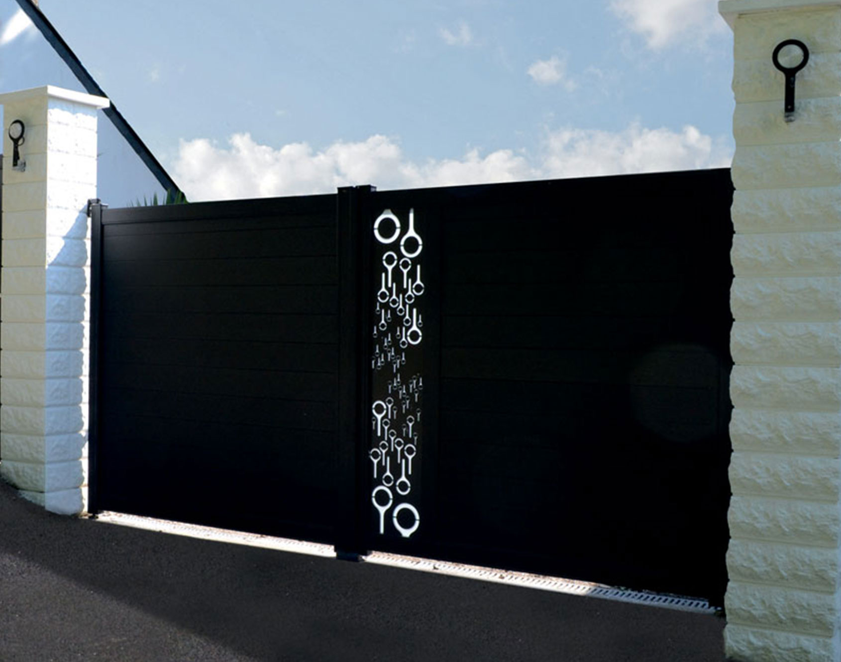 Kostum allows you to personalize your style thanks to the Arzur swing gate and its central vertical decoration. This laser-cut sheet metal will bring a touch of elegance and originality to your entrance. Sets presented: Milizin, Picto, Aelig, Dudi and Milzin.