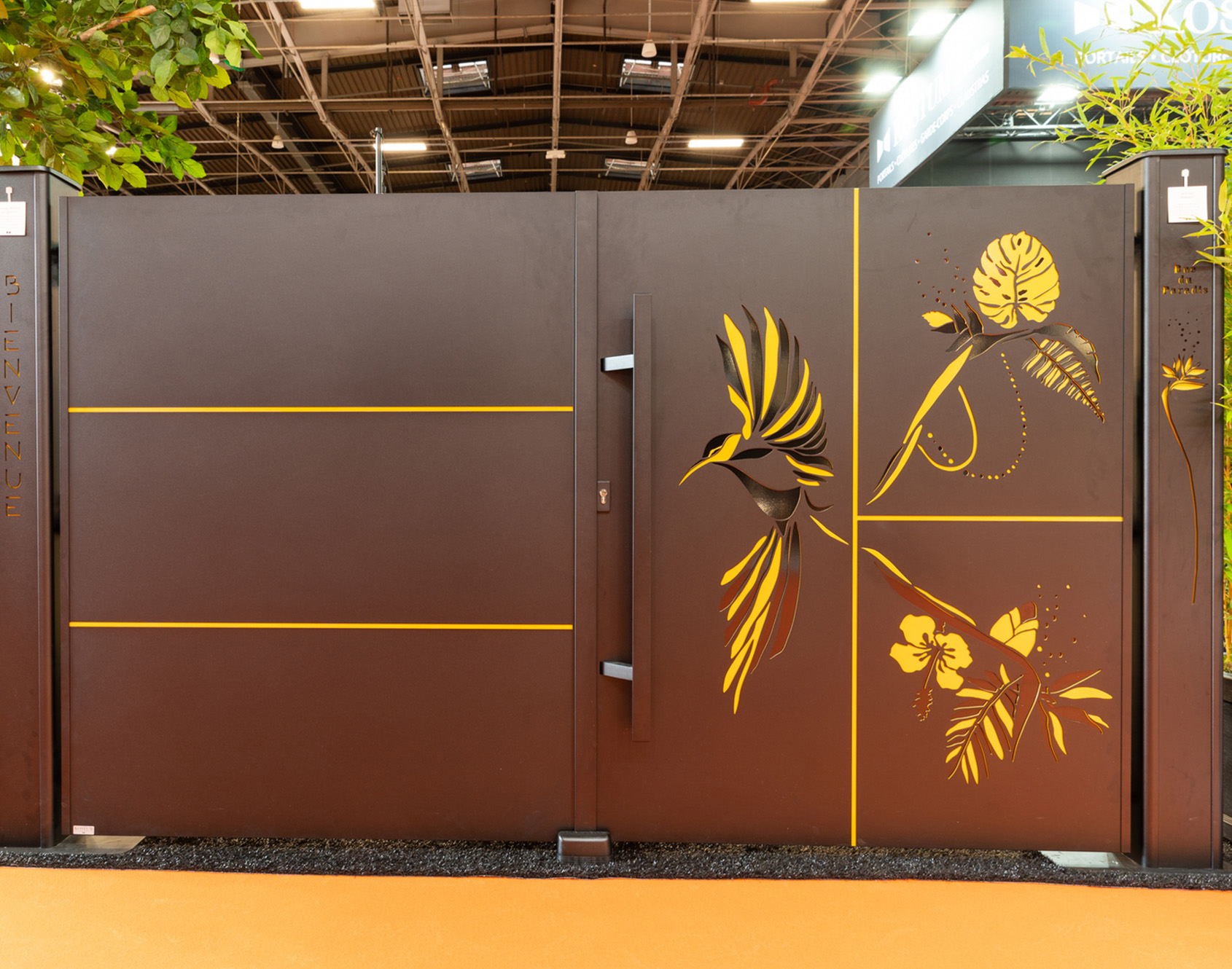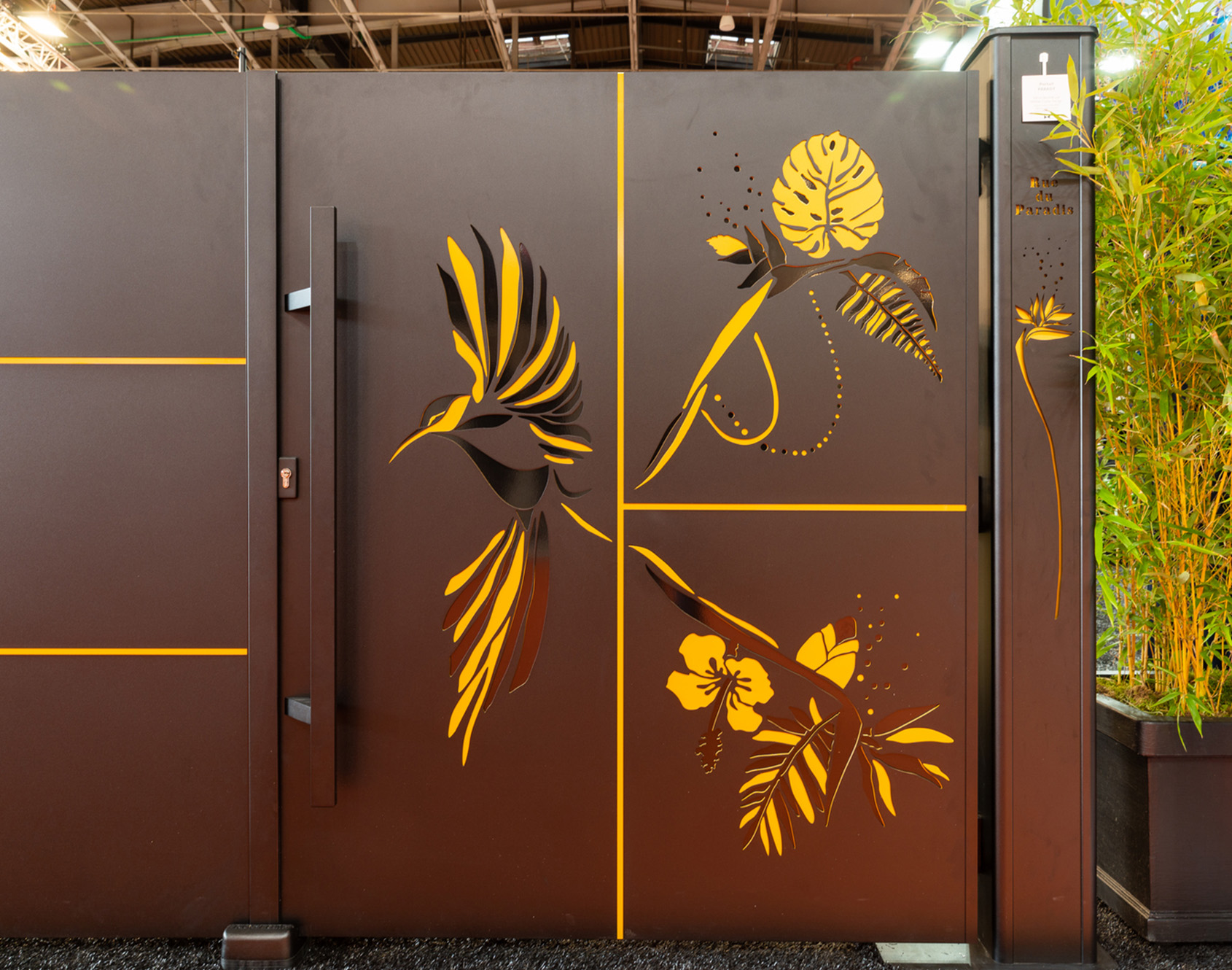 Between Cadiou and Cutter design, the collaboration continues. After having imagined young and urban decors for our gates, fences and guardrails, Gabrielle Roubas focused this year on a completely new decor. A tricolor decor! Its design is first designed to adapt to our product innovations. We have recently developed decorations in multiple colors and what could be better than the bird of paradise and its colored outfit to embody this novelty?