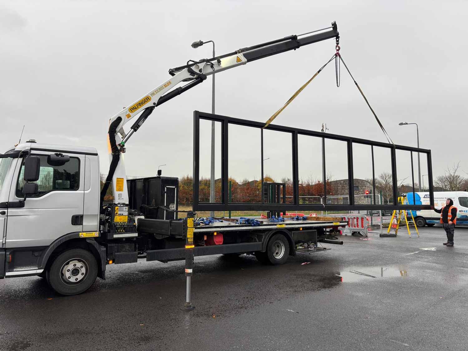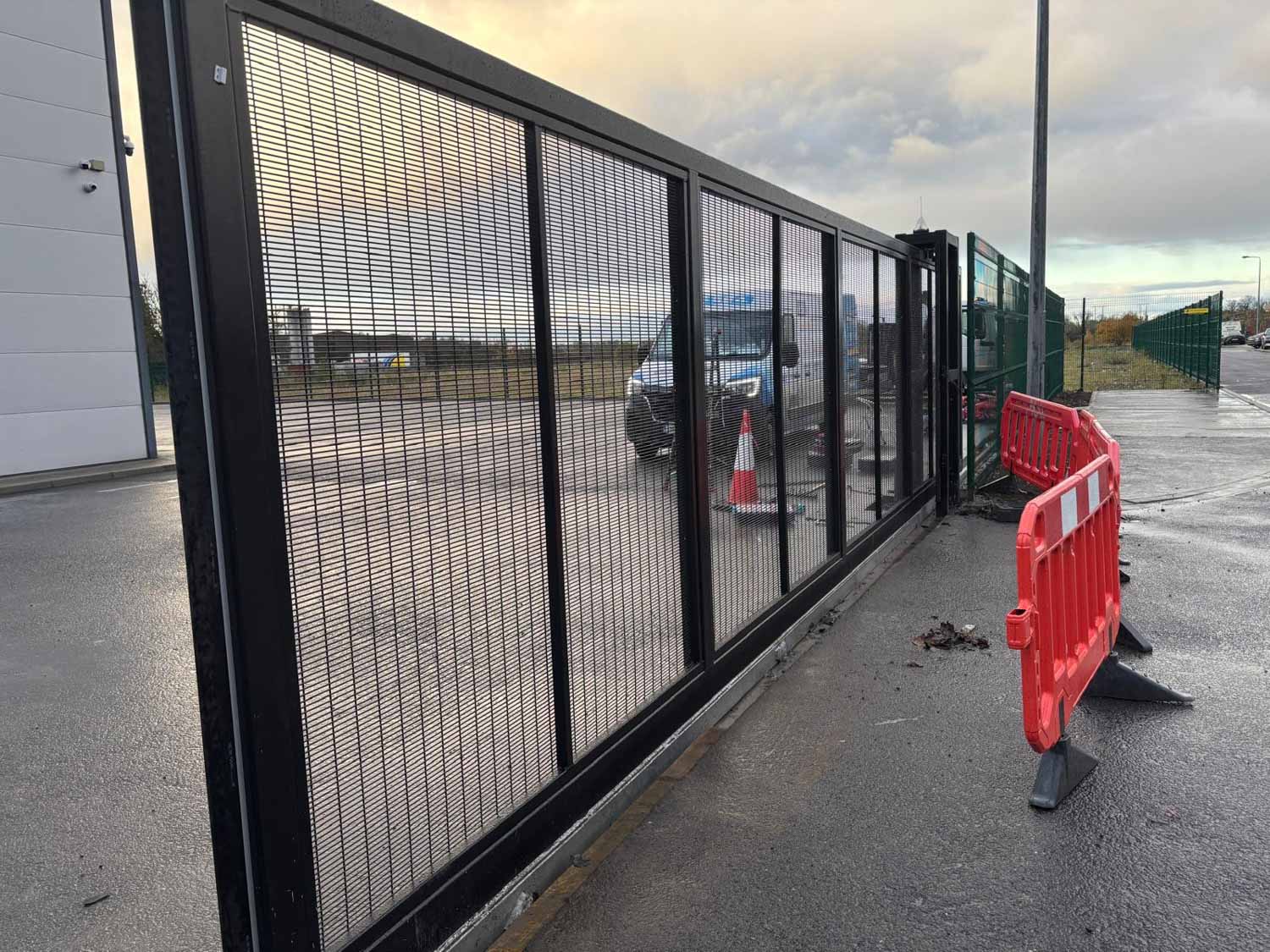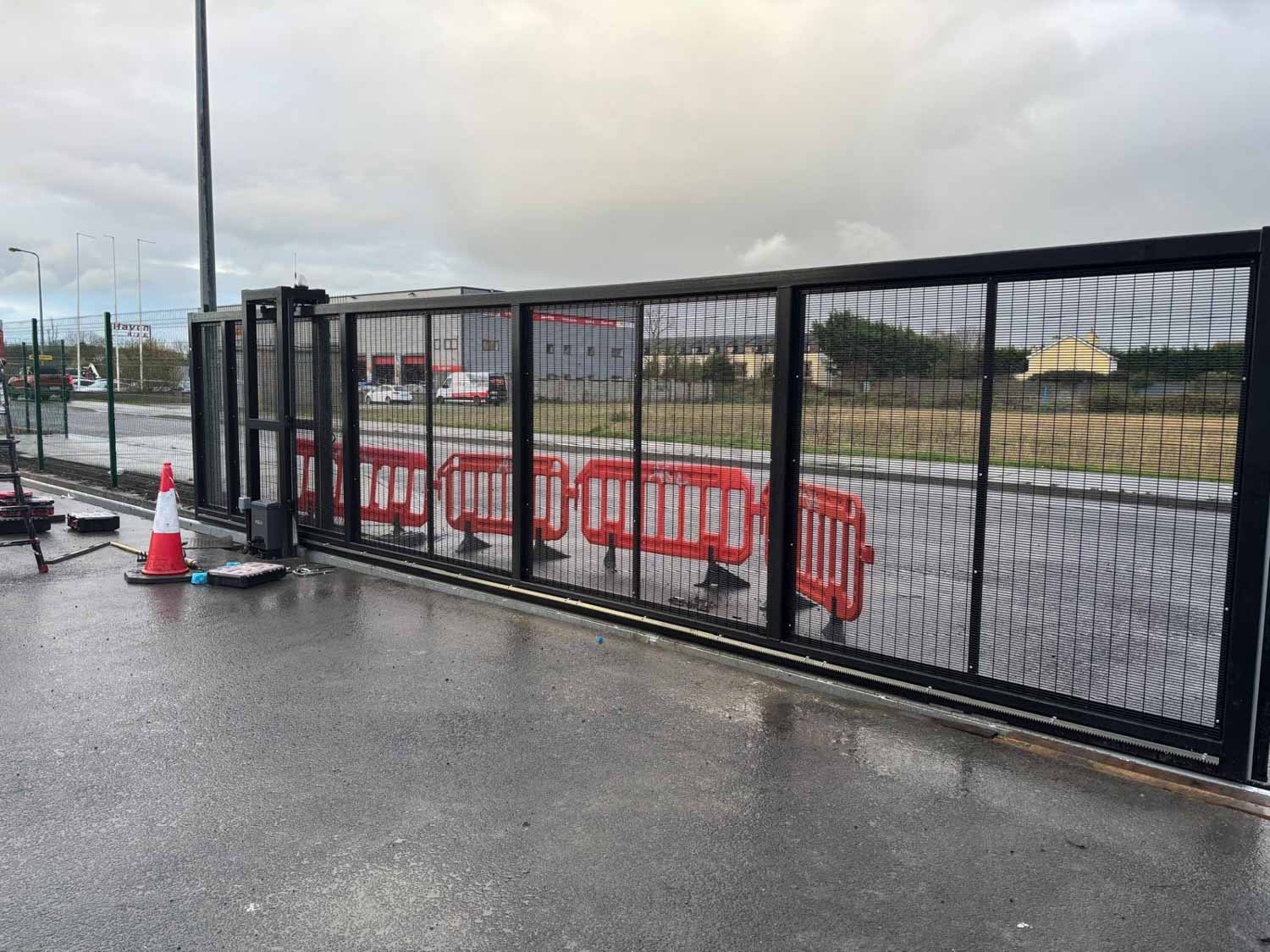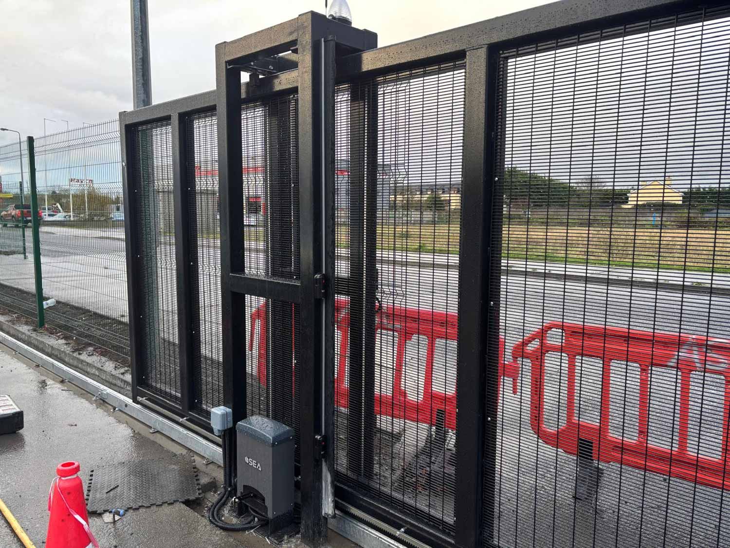 Naas Industrial sliding gate with weld mesh infill. Automated using 2000kg SEA motor with inverter technology, safety using safety edges.